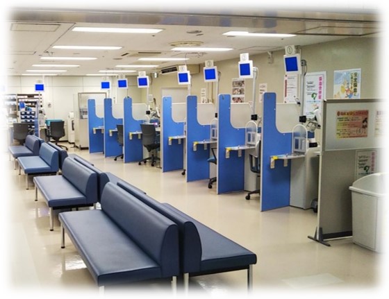 一日におよそ500~600名の患者さんの採血を行っており、採血ブースは14台用意しています。