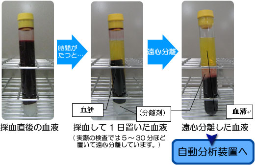 これを遠心分離器で分離し、液体成分(血清)に溶けている物質を自動分析装置で測定します。
