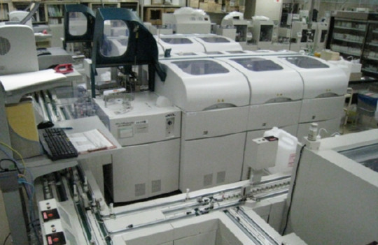 検体搬送システム・自動分析装置を使用し、1日に1000件ほどの患者さんの検体を検査しています。 検査結果は通常30分から1時間ほどで臨床へ報告し、迅速な診断・治療に貢献しています。