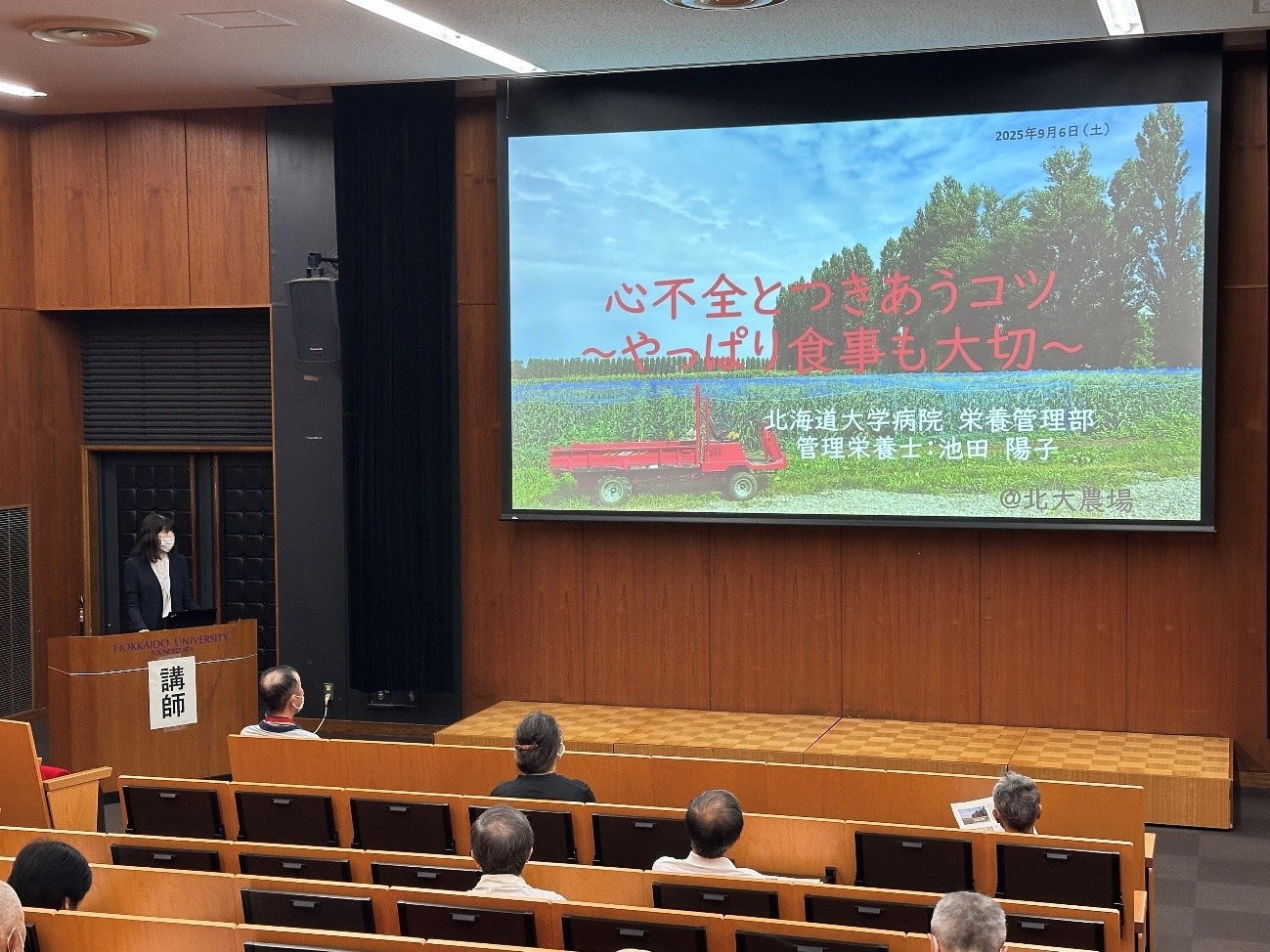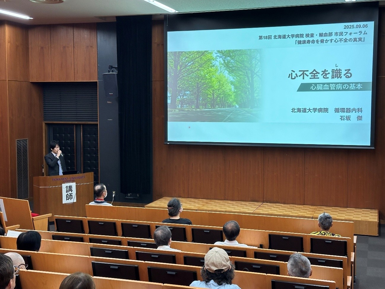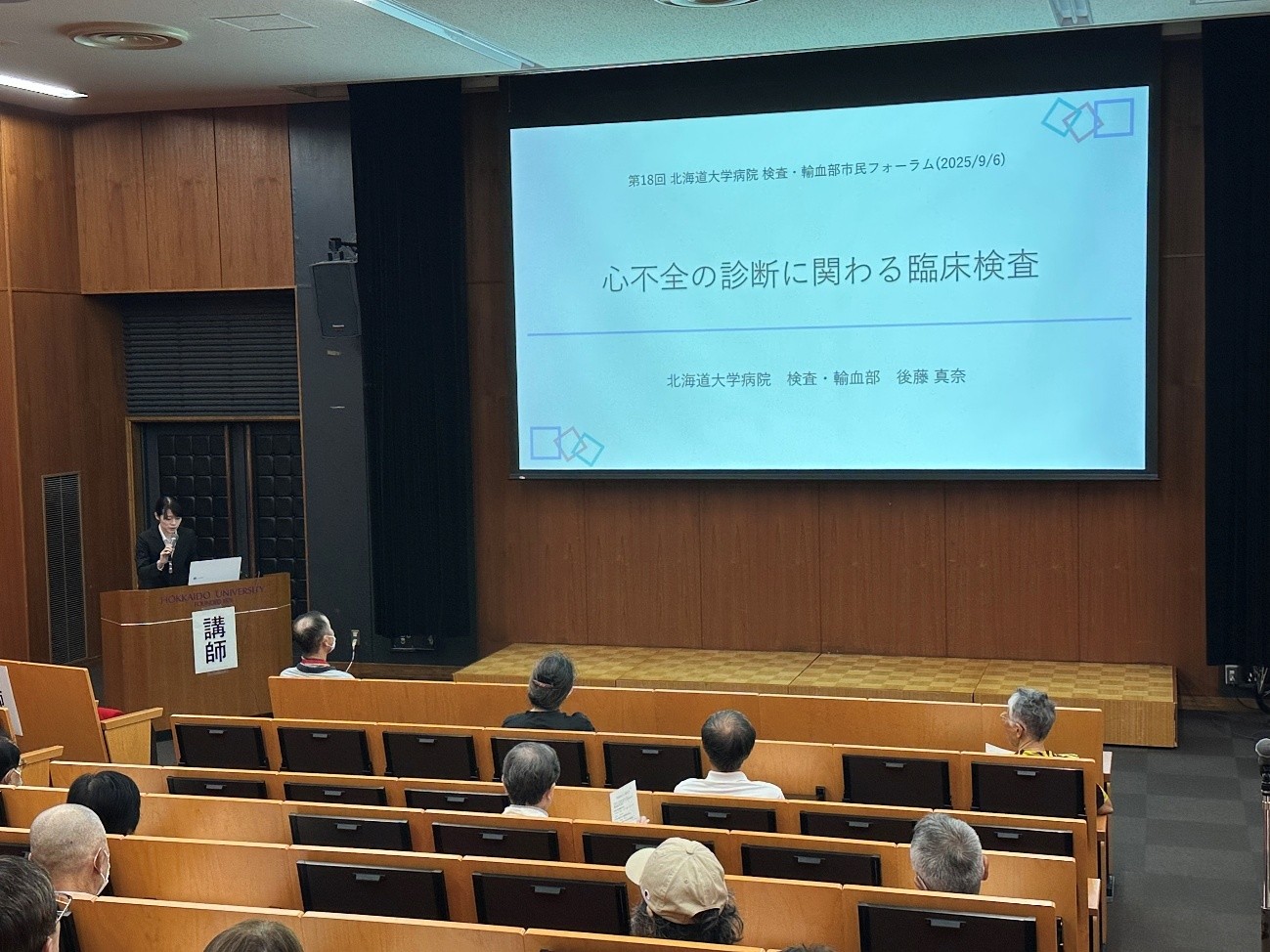 2025年9月6日(土)に北海道大学 学術交流会館にて、「第18回 北海道大学病院 検査・輸血部 市民フォーラム」を開催しました。今回は、「健康寿命を脅かす心不全の真実」と題し、循環器内科医師、臨床検査技師、管理栄養士、理学療法士の4人の講師の先生方にご講演いただきました。9月初旬の休日にもかかわらず、64名の方々にご参加していただき、誠にありがとうございました。