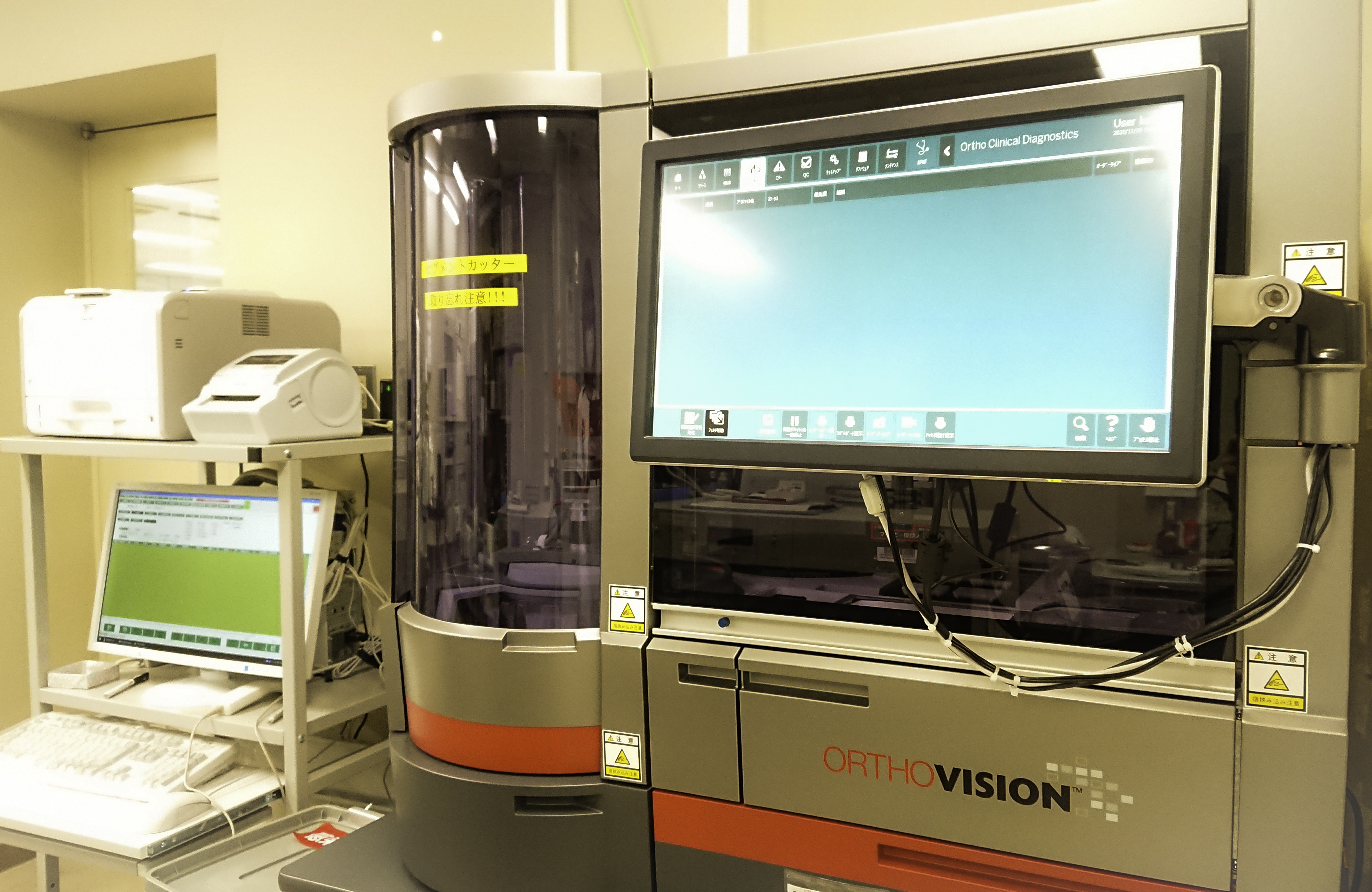 輸血検査室では血液製剤の管理から検査までの一元管理を24時間体制で行っています。