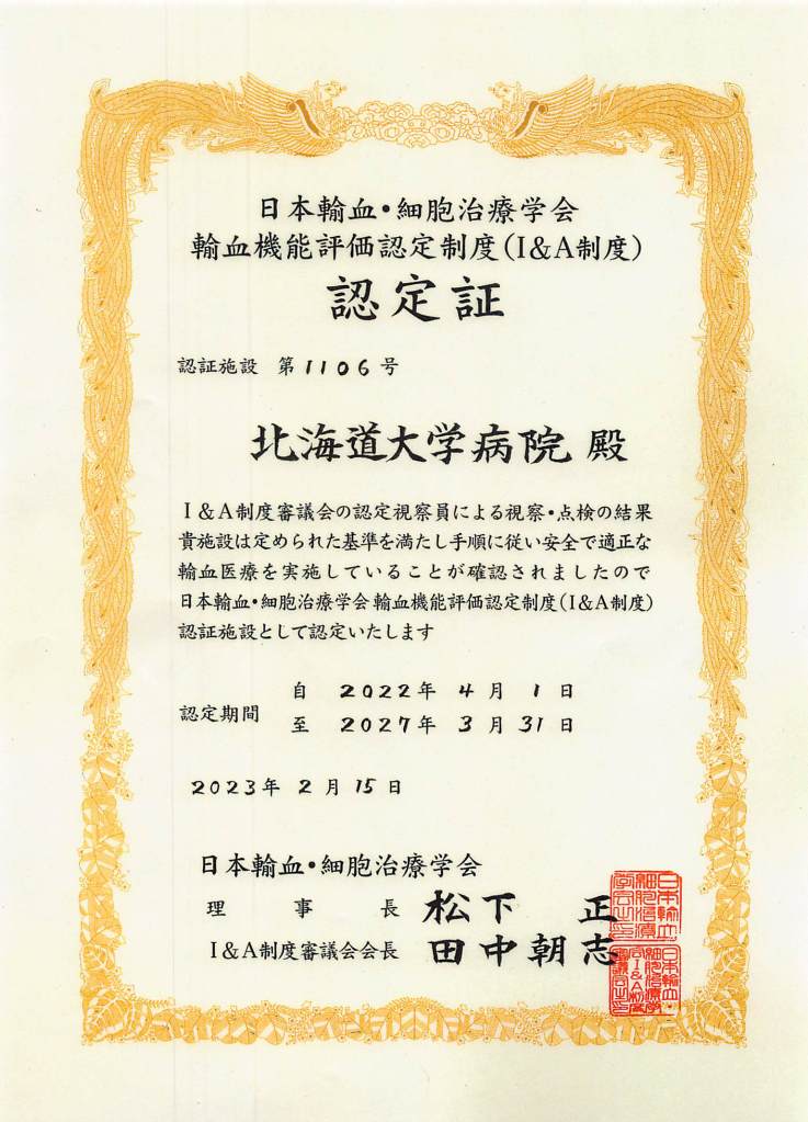 当院輸血検査室は2017年4月、輸血機能評価認定(I&A)を取得いたしました。I&Aとは、inspection(点検)してaccreditation (認証)するシステムで、日本輸血・細胞治療学会によって認定されます。I&Aを取得したということは、輸血用血液や分画製剤の適正使用を徹底し、輸血の安全を保証することで、より安全な輸血管理が行われていることを意味します。