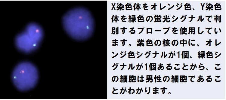 FISH法は必ずしも培養操作を必要としないため,G分染法よりも迅速に結果を報告することができます。また,染色体の状態にない時期の細胞(間期核)を多数(500~1000細胞)カウントすることから,染色体異常を有する細胞や,XX細胞とXY細胞の比率を,数値(%)として表すことできます。FISH法は,疾患の種類の特定や治療効果の判定,また異性間(男性から女性,女性から男性)の骨髄移植後の経過観察にとても有用な検査です。