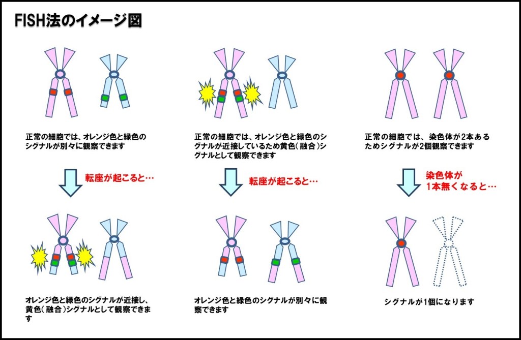 遺伝子染色体検査室で行っている染色体検査には,G分染法(G-band)とFISH法(蛍光 in situ ハイブリダイゼーション法)があります。