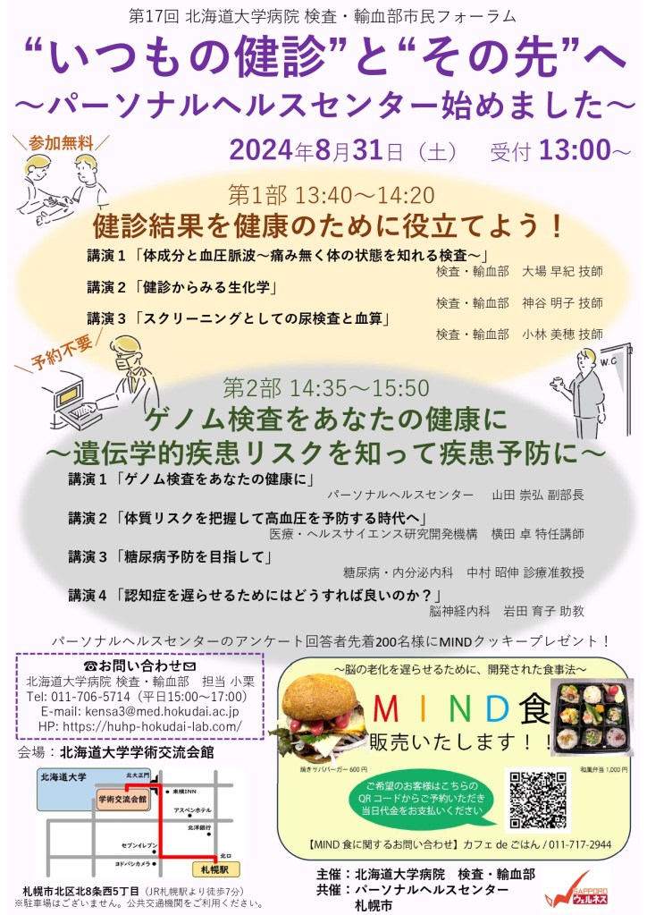 今年の検査・輸血部 市民フォーラムのテーマは、「健康診断受診の奨励と遺伝学的な背景による糖尿病・高血圧・認知症の予防」です。