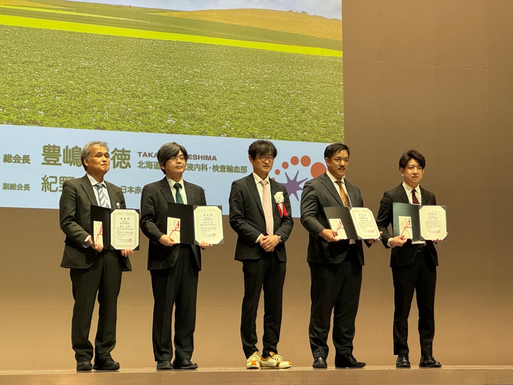本学会では全国から約300演題が発表され、その中から医師部門と医師以外のメディカルスタッフ部門として5名ずつが最優秀賞候補演題に選出され、当院検査・輸血部所属の畑瀬正尚技師がメディカル部門において「血縁ドナーにおけるpegfilgrastimとdailyG-CSFの末梢血へのCD34+細胞動員に与える影響」という発表で見事、最優秀演題賞を受賞いたしました(写真上:右から2番目)。また、医師部門では血液内科の原田晋平医師(写真下:右から2番目)と千丈創医師(写真下:右から1番目)が最優秀賞候補演題に選出され、原田医師が「CAR-T 細胞製造時のferroptosis阻害はFoxo1の核内局在を維持し,CAR-T細胞の幹細胞性,持続性と有効性を強化する」という発表で最優秀演題賞を受賞されました。