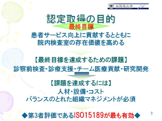2005年9月、北海道大学病院検査部は、他4施設とともに国内で初めて「臨床検査室認定」を取得しました。