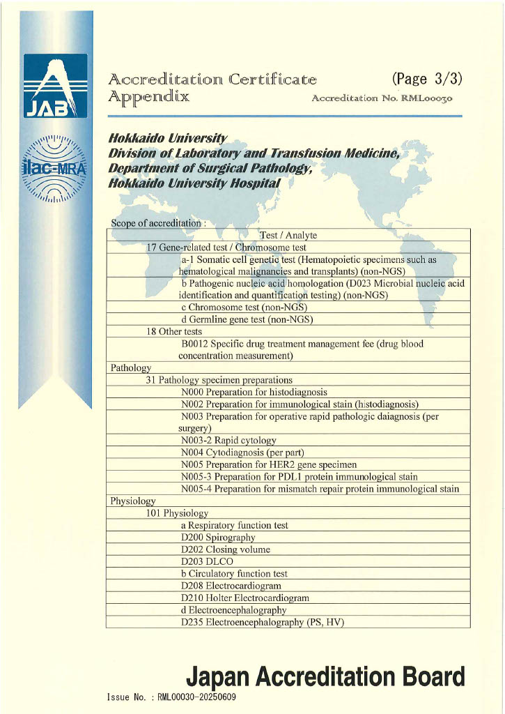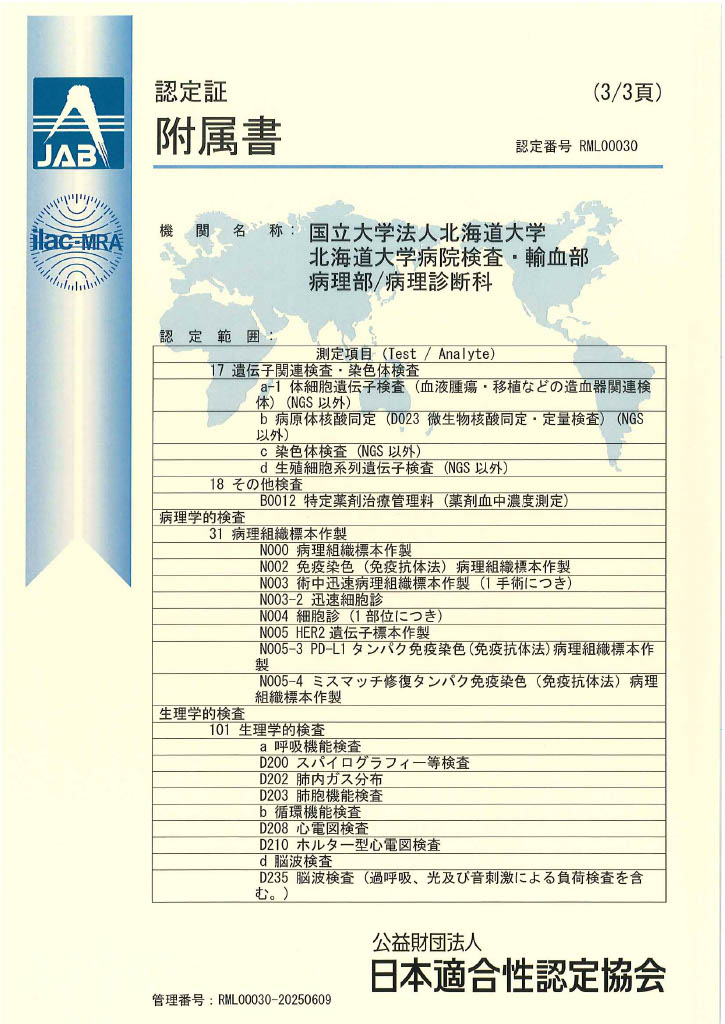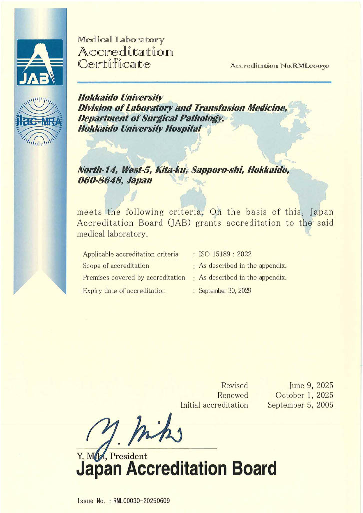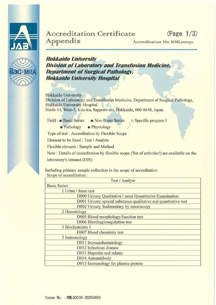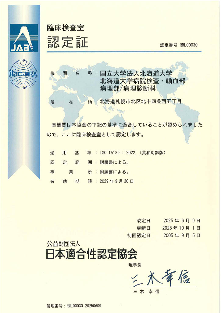 当院検査・輸血部は、2005年9月、日本最初のISO 15189認定検査室として承認されました。